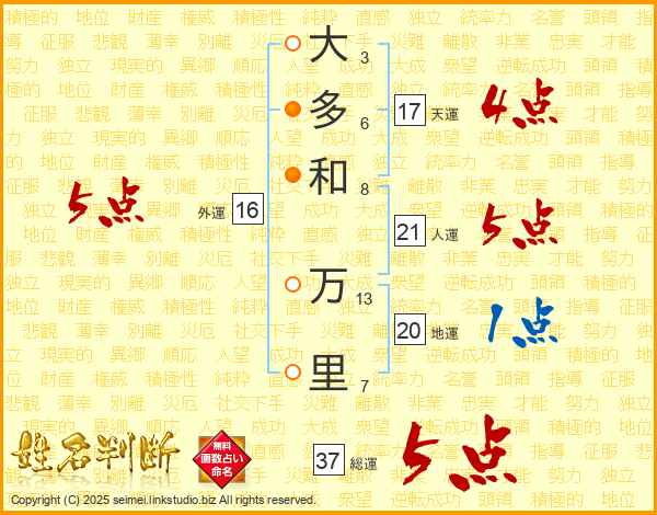 生活面を象徴する運勢です。外部から受ける影響力を表し、結婚運、家庭運や職場、環境への順応性を表します。総運から人運を引いた画数。姓や名が1文字の場合を除く。