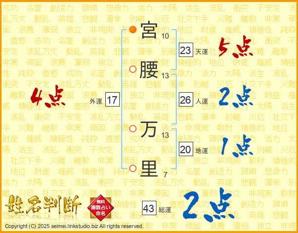 生活面を象徴する運勢です。外部から受ける影響力を表し、結婚運、家庭運や職場、環境への順応性を表します。総運から人運を引いた画数。姓や名が1文字の場合を除く。