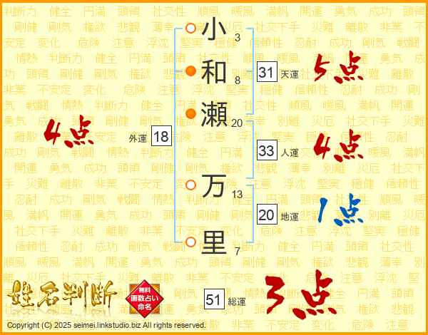 小(3画)和(8画)瀬(20画) 万(13画)里(7画)