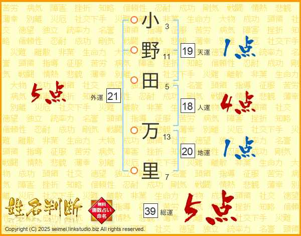 小(3画)野(11画)田(5画) 万(13画)里(7画)