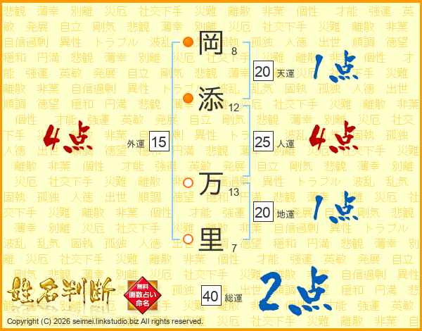 岡(8画)添(12画) 万(13画)里(7画)