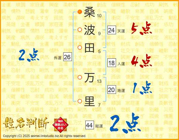 桑(10画)波(9画)田(5画) 万(13画)里(7画)