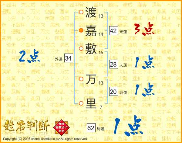生活面を象徴する運勢です。外部から受ける影響力を表し、結婚運、家庭運や職場、環境への順応性を表します。総運から人運を引いた画数。姓や名が1文字の場合を除く。
