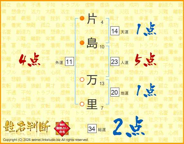 生活面を象徴する運勢です。外部から受ける影響力を表し、結婚運、家庭運や職場、環境への順応性を表します。総運から人運を引いた画数。姓や名が1文字の場合を除く。