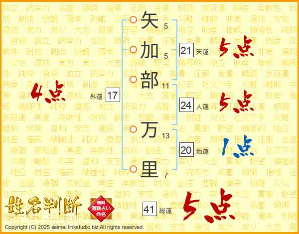 矢(5画)加(5画)部(11画) 万(13画)里(7画)