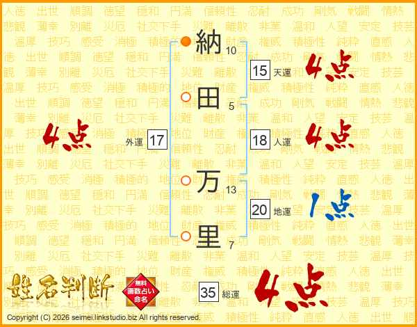 生活面を象徴する運勢です。外部から受ける影響力を表し、結婚運、家庭運や職場、環境への順応性を表します。総運から人運を引いた画数。姓や名が1文字の場合を除く。