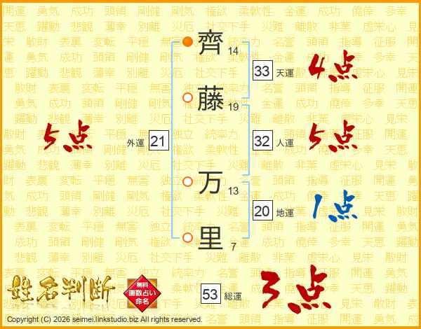 齊(14画)藤(19画) 万(13画)里(7画)