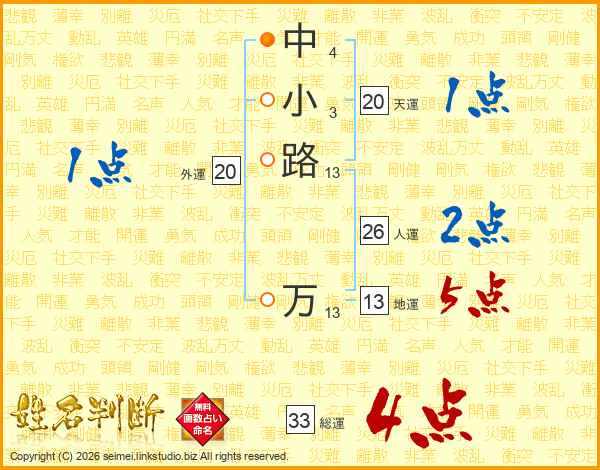 生活面を象徴する運勢です。外部から受ける影響力を表し、結婚運、家庭運や職場、環境への順応性を表します。総運から人運を引いた画数。姓や名が1文字の場合を除く。