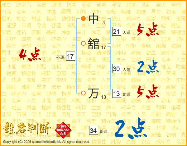 中舘万さんの総運は34画の2点!