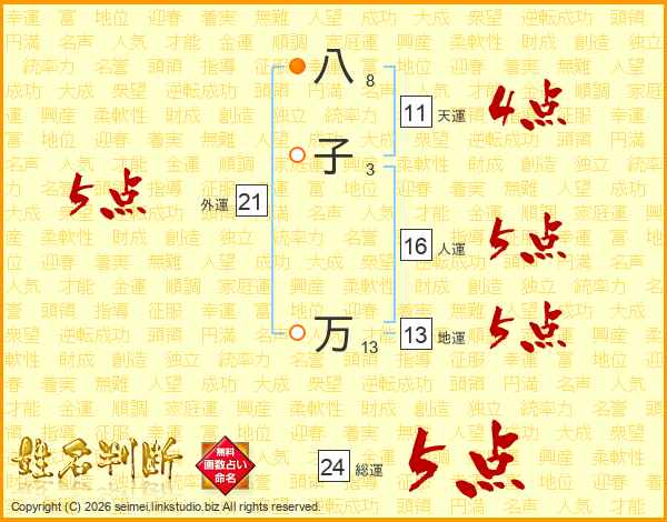 生活面を象徴する運勢です。外部から受ける影響力を表し、結婚運、家庭運や職場、環境への順応性を表します。総運から人運を引いた画数。姓や名が1文字の場合を除く。