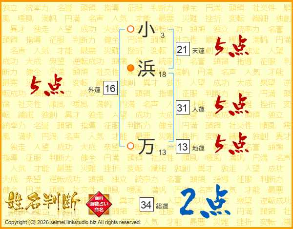 あなたの人生を表す1番重要な運勢です。生涯を通じて影響する総合運となり、主に50歳以降の晩年期に影響を及ぼします。苗字と名前の合計画数。