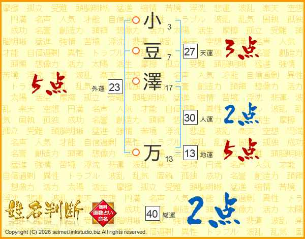 小豆澤万さんの総運は40画の2点!
