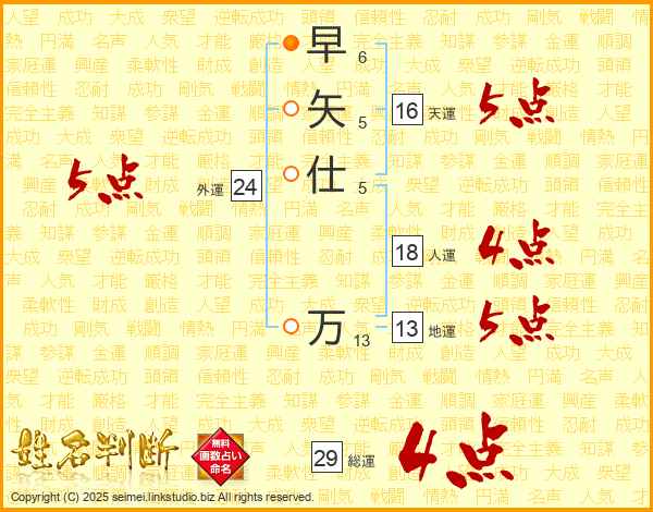 あなたの人生を表す1番重要な運勢です。生涯を通じて影響する総合運となり、主に50歳以降の晩年期に影響を及ぼします。苗字と名前の合計画数。