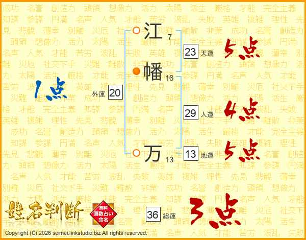 生活面を象徴する運勢です。外部から受ける影響力を表し、結婚運、家庭運や職場、環境への順応性を表します。総運から人運を引いた画数。姓や名が1文字の場合を除く。