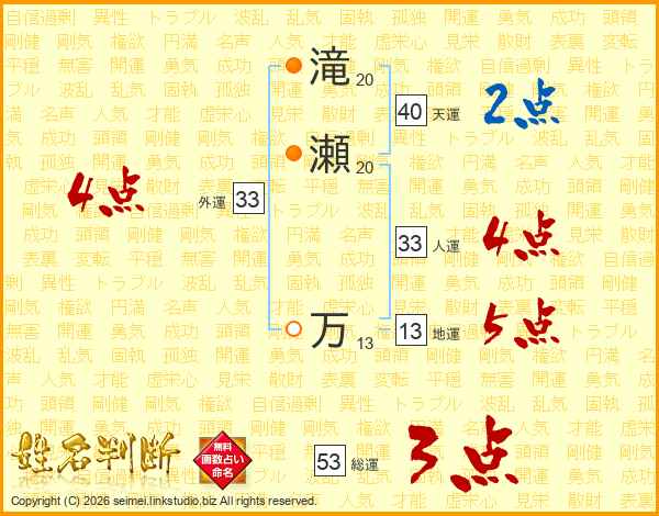 生活面を象徴する運勢です。外部から受ける影響力を表し、結婚運、家庭運や職場、環境への順応性を表します。総運から人運を引いた画数。姓や名が1文字の場合を除く。