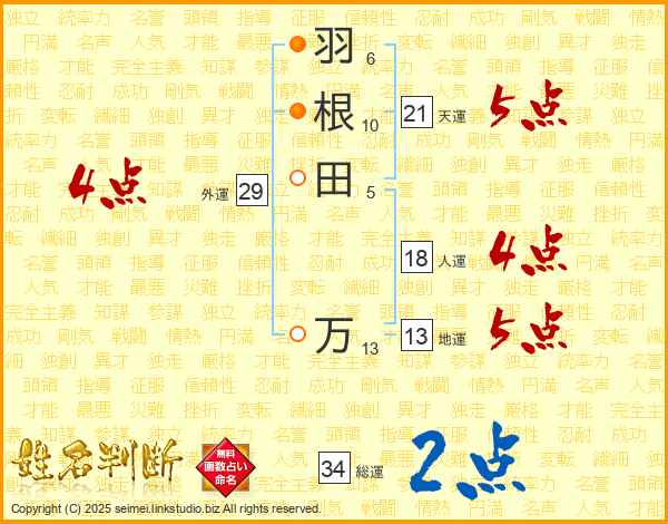 羽根田万さんの天運は21画の5点!