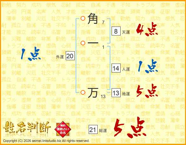 生活面を象徴する運勢です。外部から受ける影響力を表し、結婚運、家庭運や職場、環境への順応性を表します。総運から人運を引いた画数。姓や名が1文字の場合を除く。