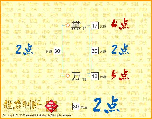 生活面を象徴する運勢です。外部から受ける影響力を表し、結婚運、家庭運や職場、環境への順応性を表します。総運から人運を引いた画数。姓や名が1文字の場合を除く。