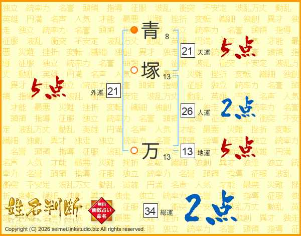 あなたの人生を表す1番重要な運勢です。生涯を通じて影響する総合運となり、主に50歳以降の晩年期に影響を及ぼします。苗字と名前の合計画数。