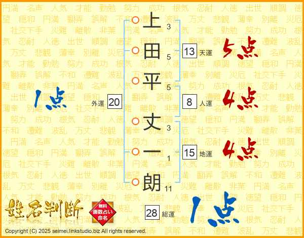 上(3画)田(5画)平(5画) 丈(3画)一(1画)朗(11画)