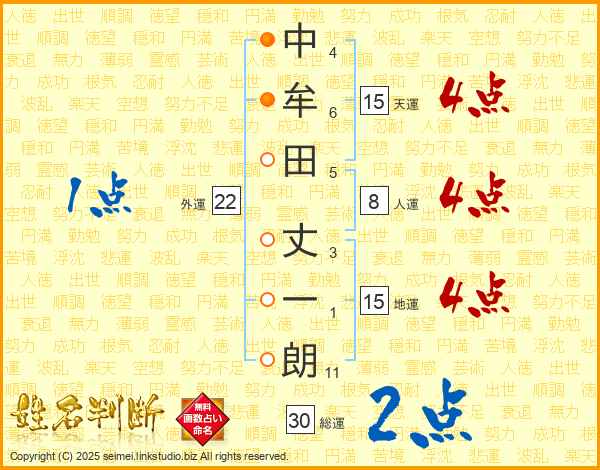 中(4画)牟(6画)田(5画) 丈(3画)一(1画)朗(11画)