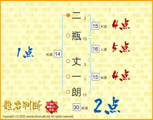 生活面を象徴する運勢です。外部から受ける影響力を表し、結婚運、家庭運や職場、環境への順応性を表します。総運から人運を引いた画数。姓や名が1文字の場合を除く。