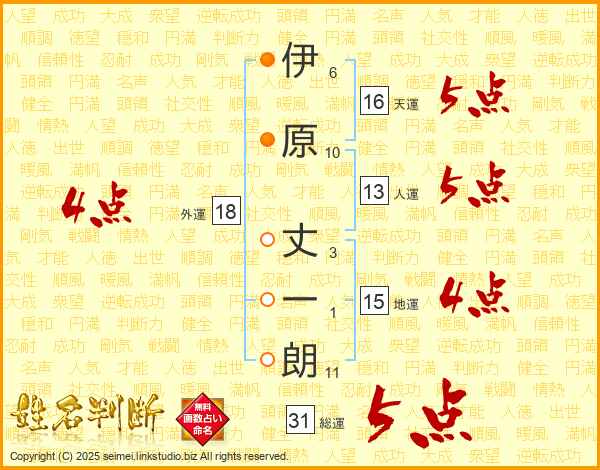 伊(6画)原(10画) 丈(3画)一(1画)朗(11画)