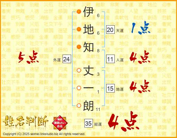 伊(6画)地(6画)知(8画) 丈(3画)一(1画)朗(11画)