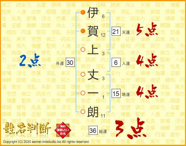 伊(6画)賀(12画)上(3画) 丈(3画)一(1画)朗(11画)