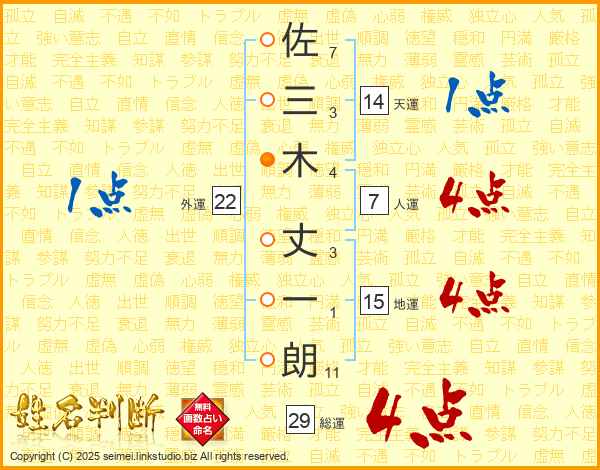 佐(7画)三(3画)木(4画) 丈(3画)一(1画)朗(11画)