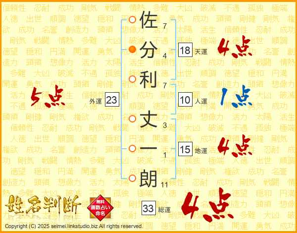 佐(7画)分(4画)利(7画) 丈(3画)一(1画)朗(11画)