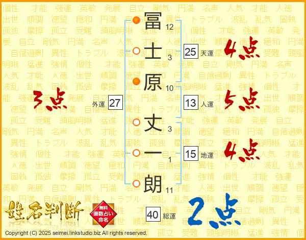 冨(12画)士(3画)原(10画) 丈(3画)一(1画)朗(11画)