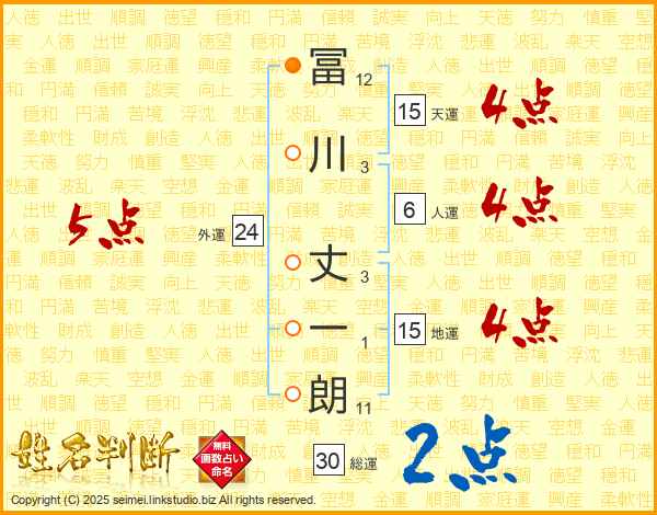 冨(12画)川(3画) 丈(3画)一(1画)朗(11画)