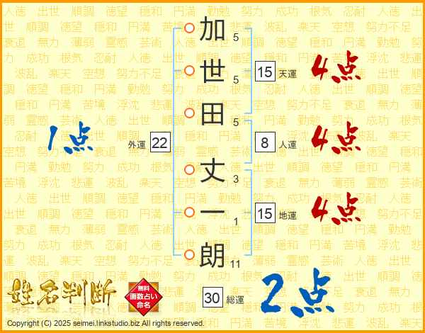 加(5画)世(5画)田(5画) 丈(3画)一(1画)朗(11画)