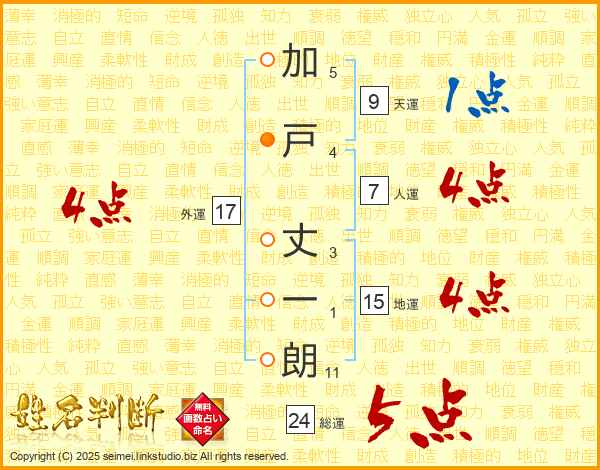 加(5画)戸(4画) 丈(3画)一(1画)朗(11画)