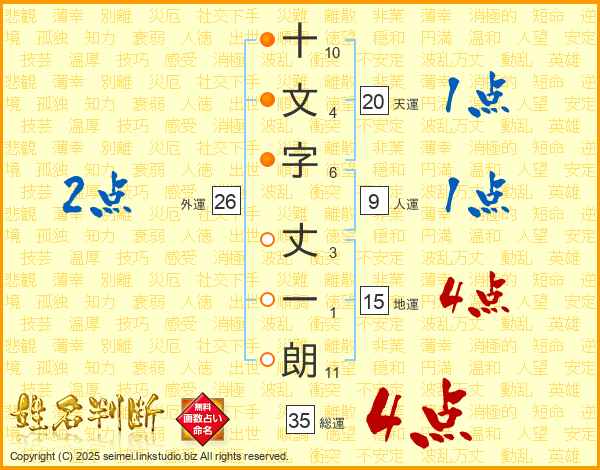 あなたの人生を表す1番重要な運勢です。生涯を通じて影響する総合運となり、主に50歳以降の晩年期に影響を及ぼします。苗字と名前の合計画数。