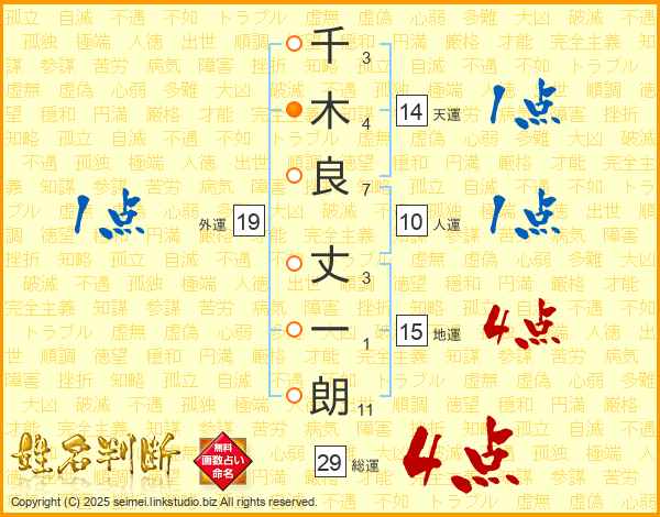 千(3画)木(4画)良(7画) 丈(3画)一(1画)朗(11画)