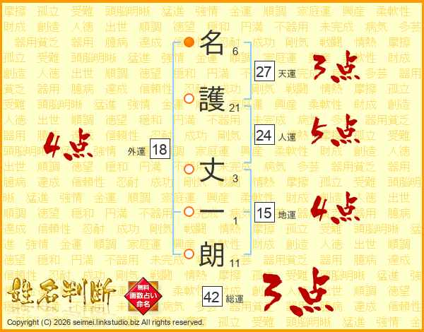 名(6画)護(21画) 丈(3画)一(1画)朗(11画)