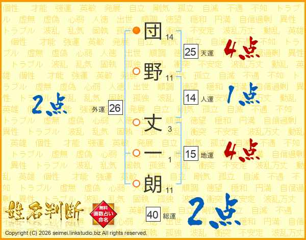 団(14画)野(11画) 丈(3画)一(1画)朗(11画)