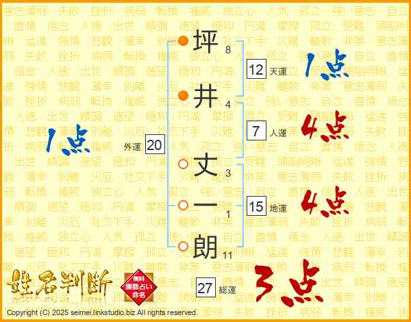 坪(8画)井(4画) 丈(3画)一(1画)朗(11画)