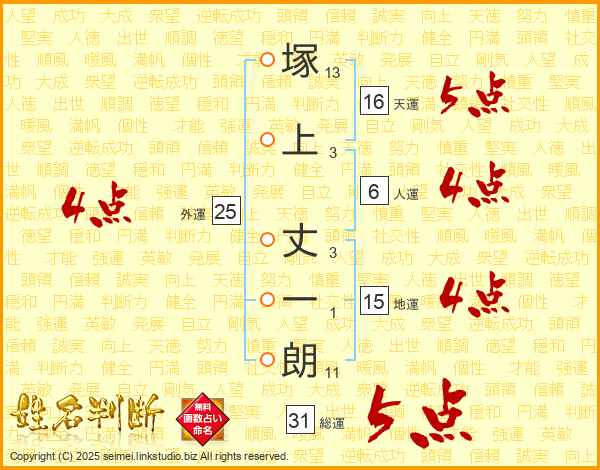 塚(13画)上(3画) 丈(3画)一(1画)朗(11画)