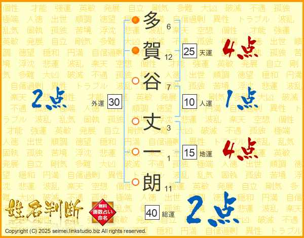多(6画)賀(12画)谷(7画) 丈(3画)一(1画)朗(11画)