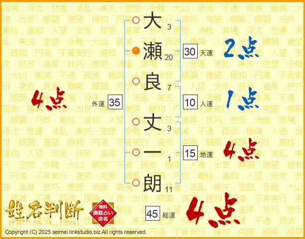大(3画)瀬(20画)良(7画) 丈(3画)一(1画)朗(11画)