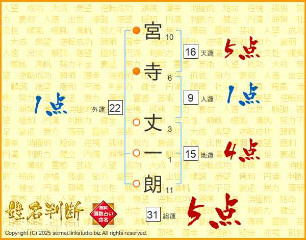 宮(10画)寺(6画) 丈(3画)一(1画)朗(11画)