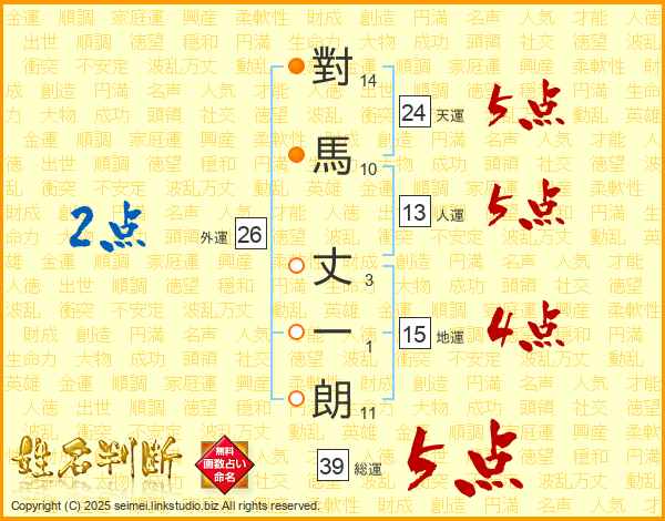 對(14画)馬(10画) 丈(3画)一(1画)朗(11画)