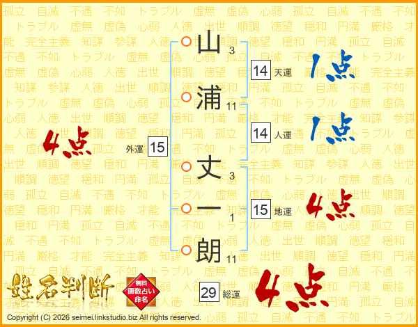 山(3画)浦(11画) 丈(3画)一(1画)朗(11画)