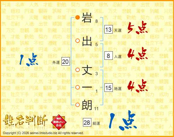 岩(8画)出(5画) 丈(3画)一(1画)朗(11画)