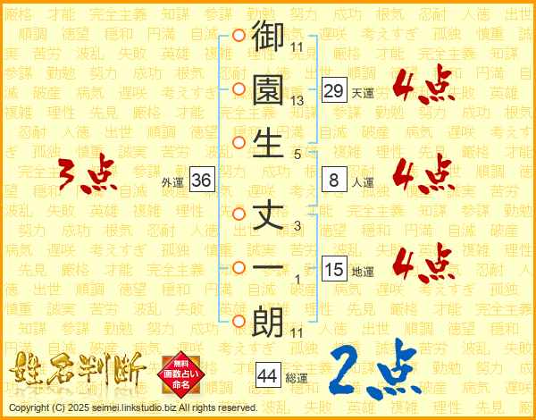 御(11画)園(13画)生(5画) 丈(3画)一(1画)朗(11画)