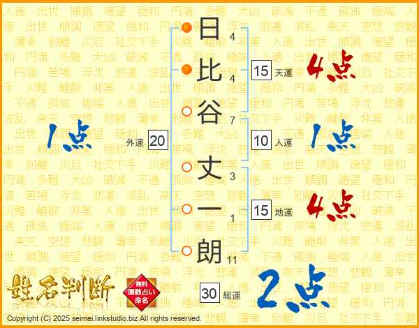 日(4画)比(4画)谷(7画) 丈(3画)一(1画)朗(11画)