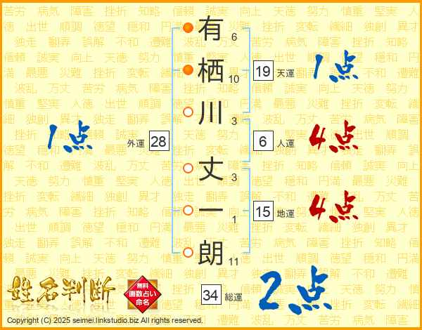 有(6画)栖(10画)川(3画) 丈(3画)一(1画)朗(11画)